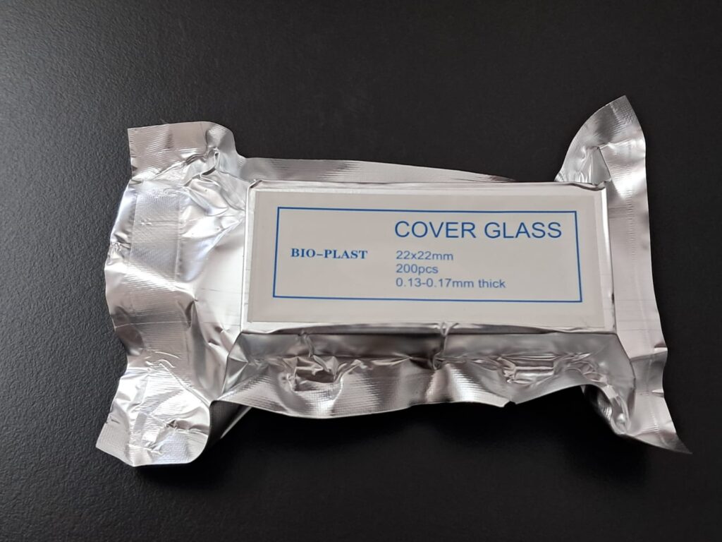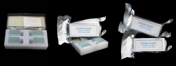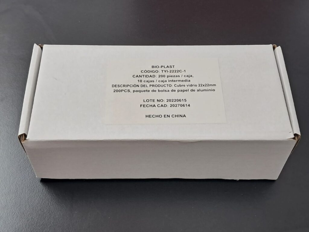 Cubreobjeto 22 x 22. Presentado en cajas con envoltorio de aluminio individual x 200 vidrios, envasado al vacío. Vidrio claro, limpio y desengrasado. Uso para protección de la muestra. Grosor 0,13 - 0,17mm.
