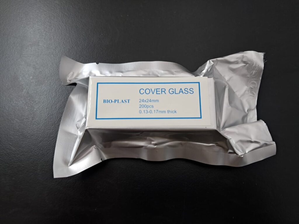 Cubreobjeto 24 x 24. Presentado en cajas con envoltorio de aluminio individual x 200 vidrios, envasado al vacío. Vidrio claro, limpio y desengrasado. Uso para protección de la muestra. Grosor 0,13 - 0,17mm.