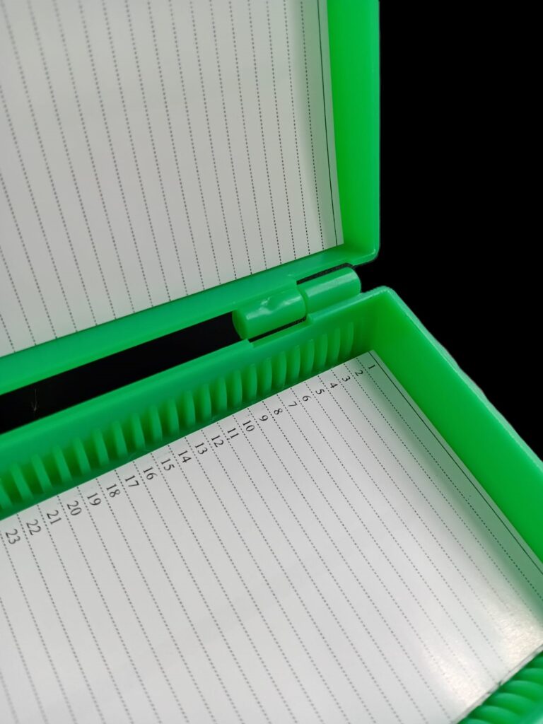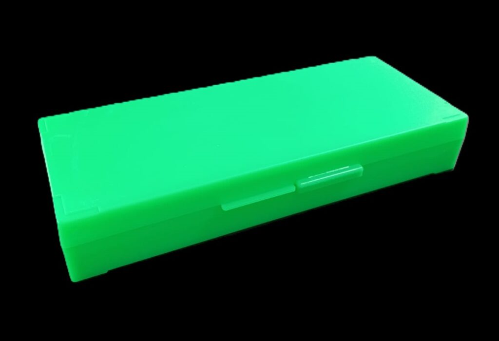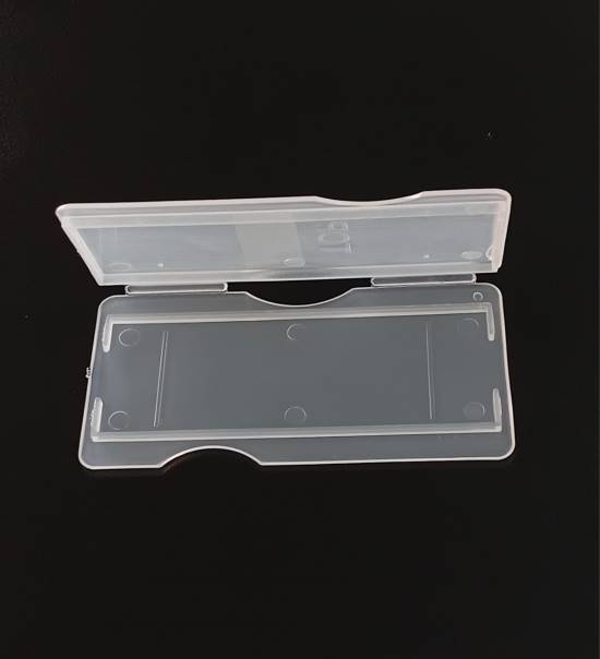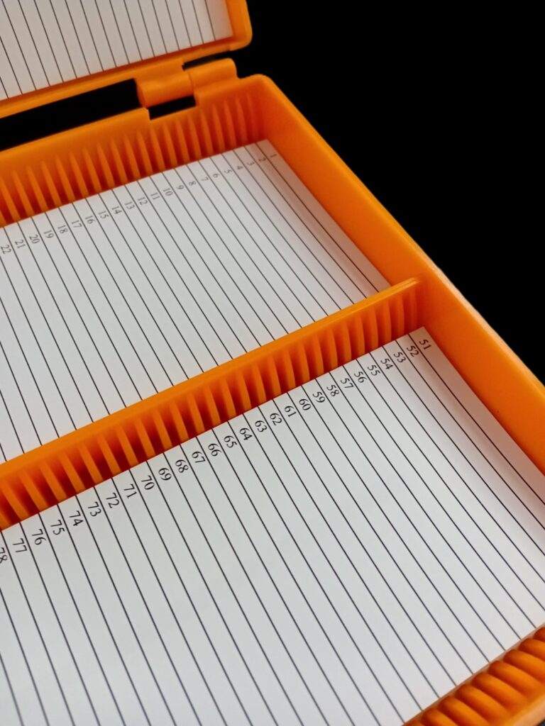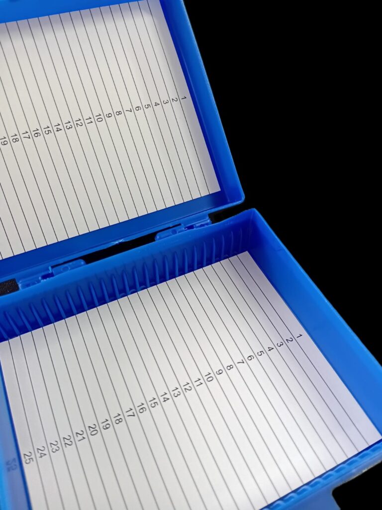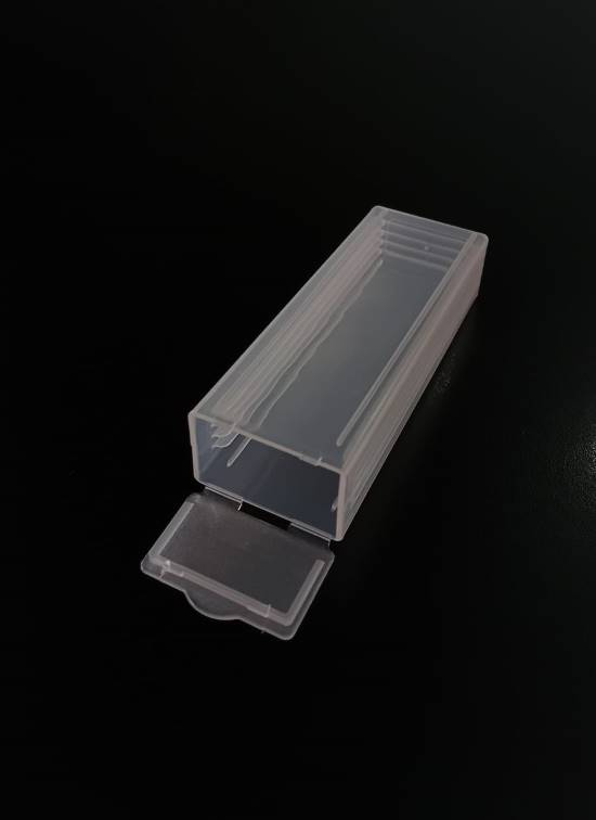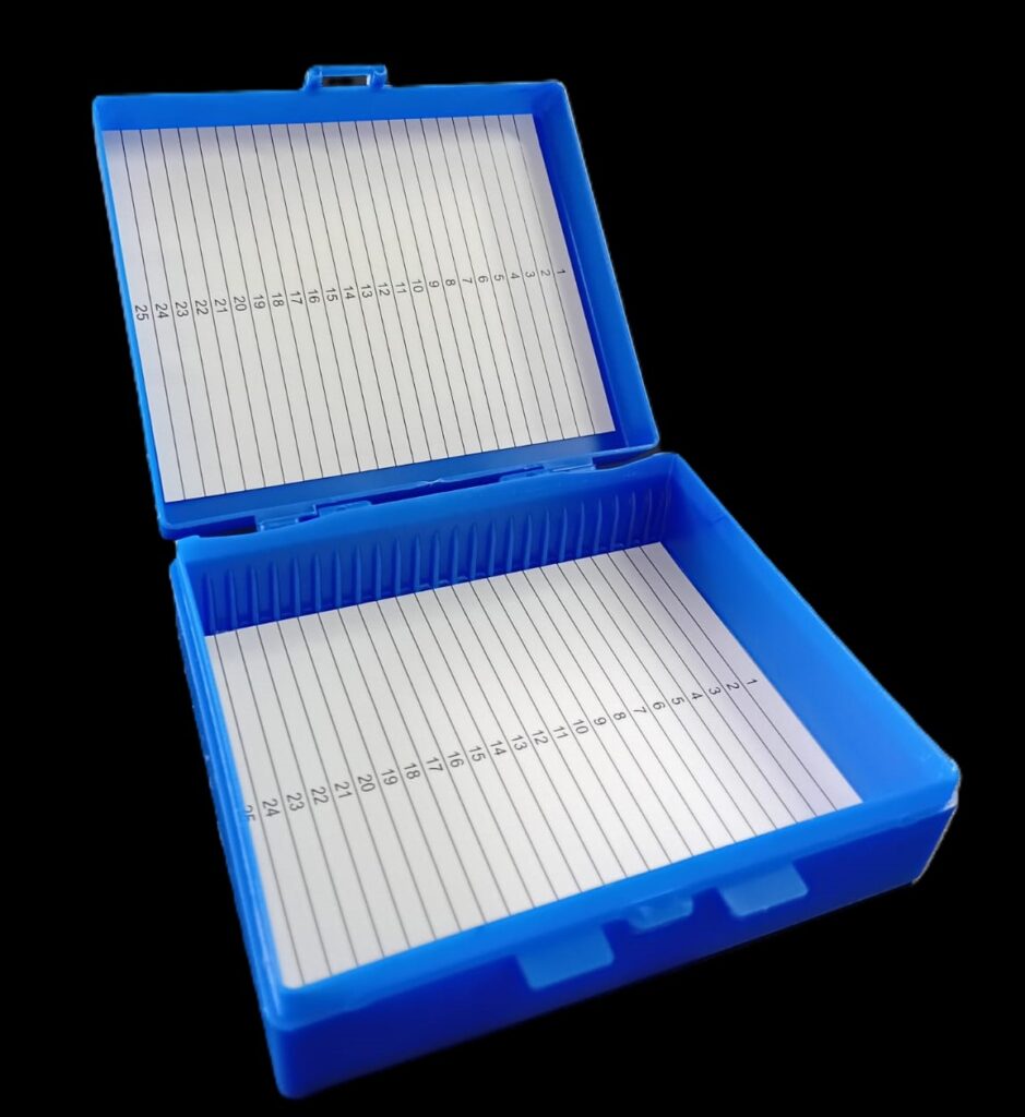 Caja para 50 portaobjetos. Cajas para el archivo y transporte de 50 portaobjetos. Poseen leves muescas en las esquinas que posibilitan apilarlas estando cerradas. Consultar colores disponibles: blanca, naranja, verde, azul