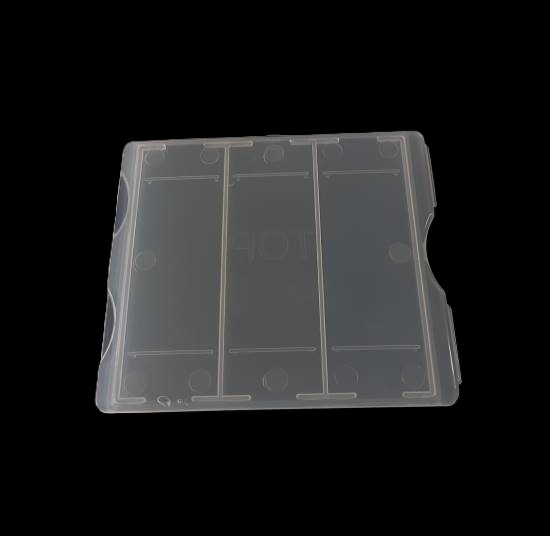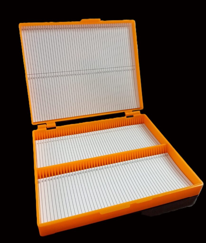 Caja para 100 portaobjetos Cajas para el archivo y transporte de 100 portaobjetos. Poseen leves muescas en las esquinas que posibilitan apilarlas estando cerradas. Consultar colores disponibles: blanca, naranja, verde, azul