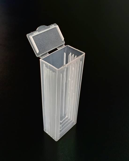 Cubetas para espectofotometro en PS óptico 2,5 ml semimicro. La cubeta está hecha de material polimérico transparente y moldeado por inyección de poliestireno. El producto es suave y limpio. Es adecuado para varios sistemas de análisis maduros como coagulómetro y análisis bioquímico Cubetas de un solo uso utilizables en la mayor parte de espectrofotómetros abiertos. Las variaciones en la absorción se encuentran en el umbral de ± 1%. Las cubetas se presentan en cajas de poliestireno expandido (100 unidades) con tapa