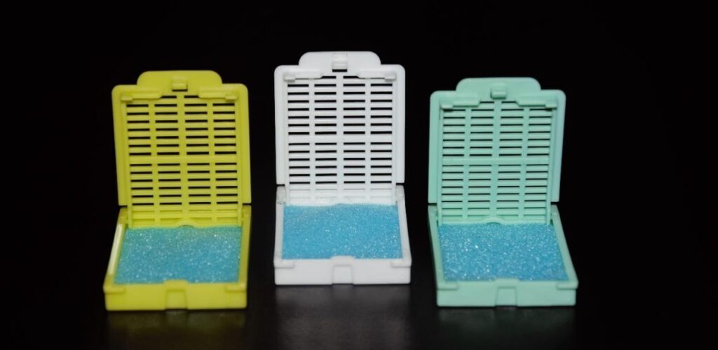 Cassettes para tejidos de poliacetal TIPO HISTOSETTE I, agujeros en tiras, dispuestos en 16 x 4, terminación media. Consultar colores disponibles: BLANCO