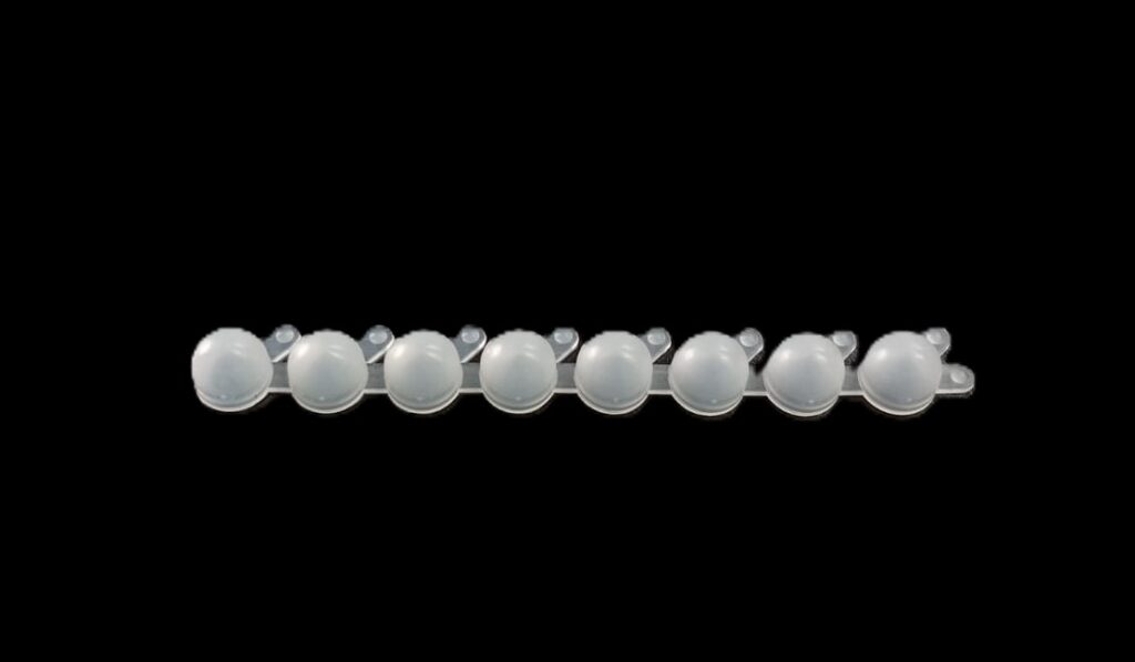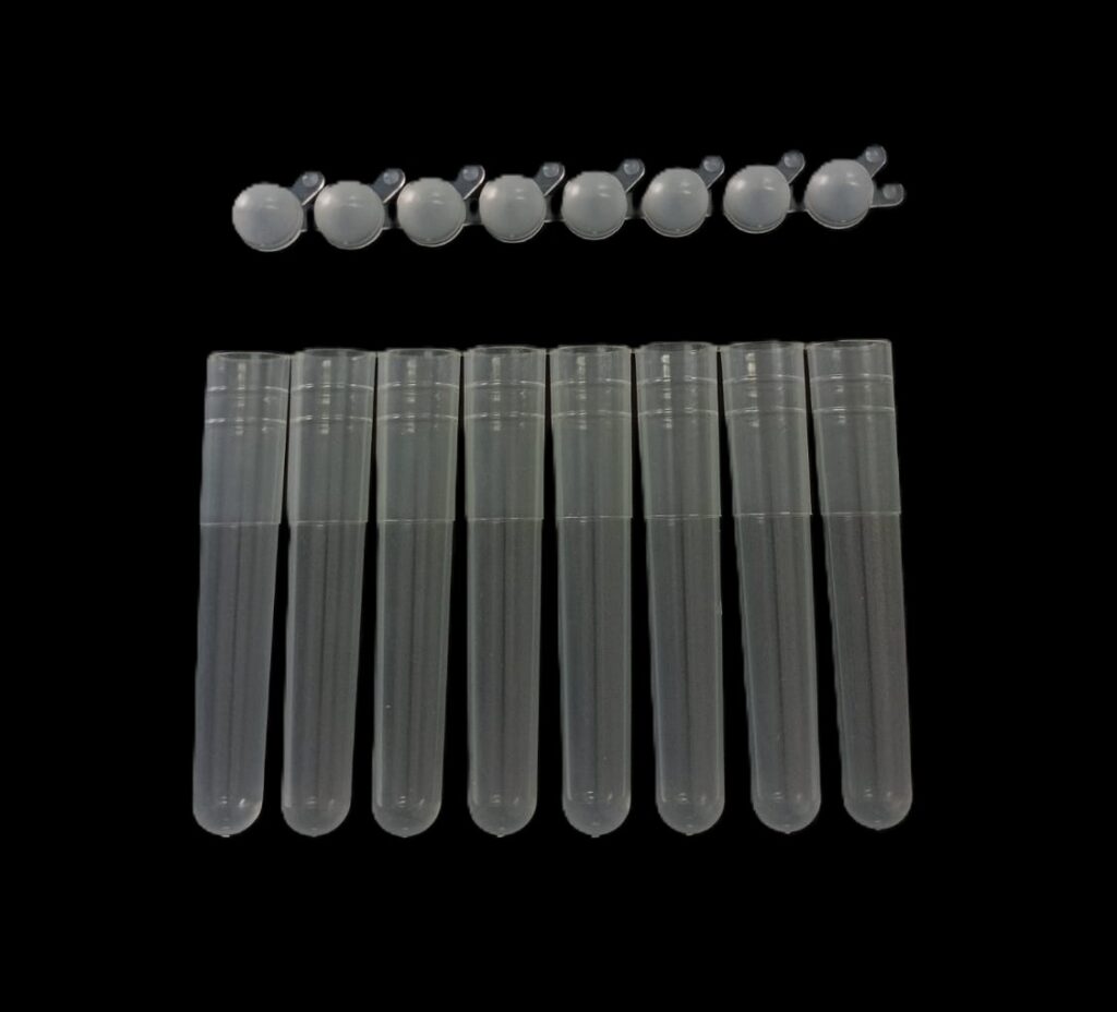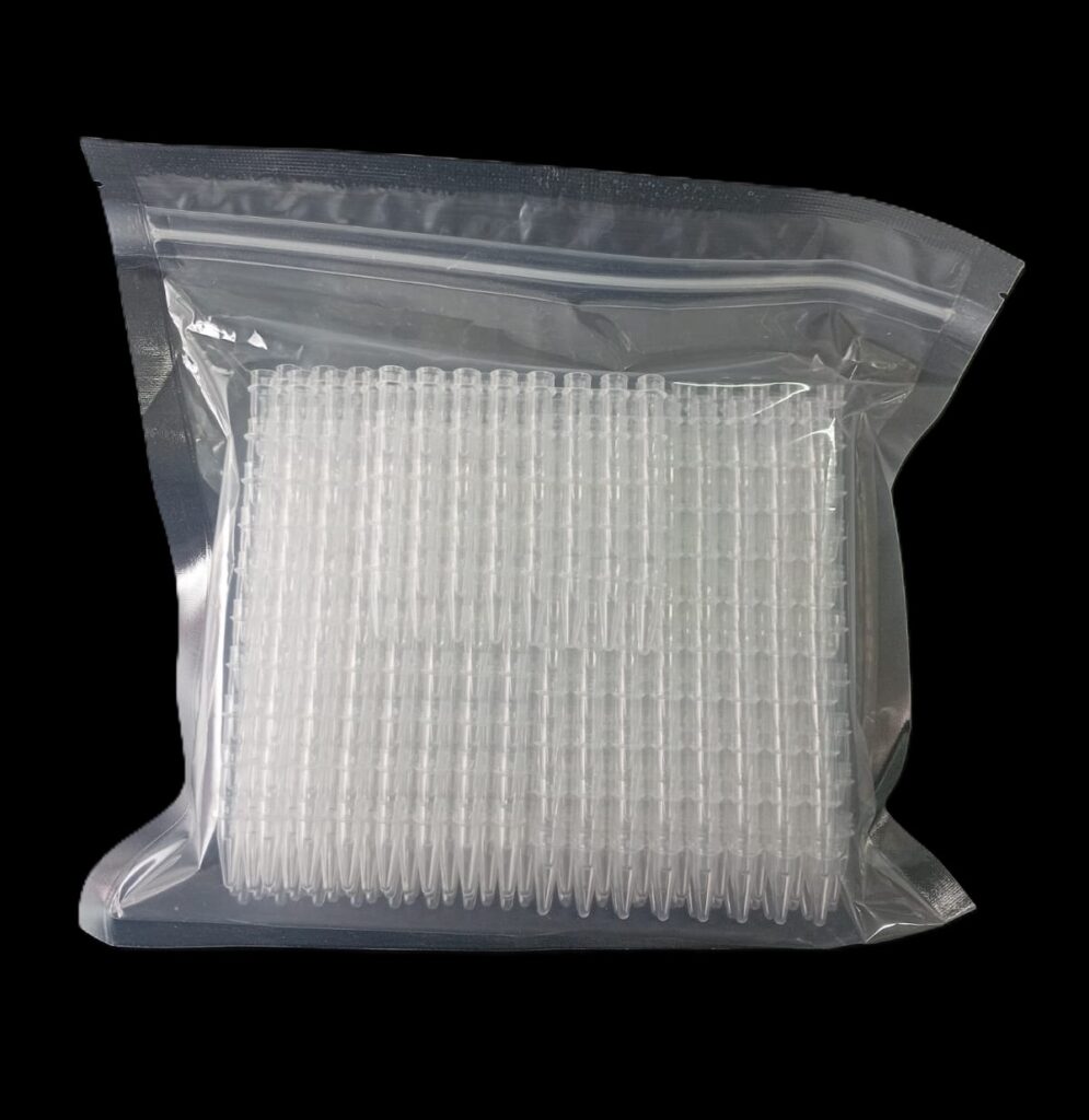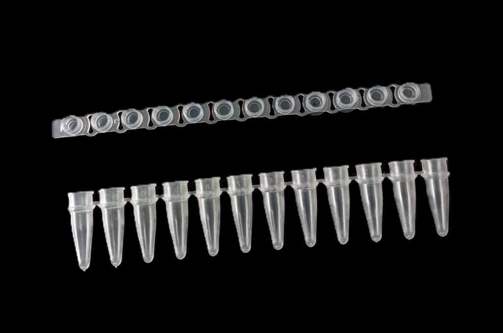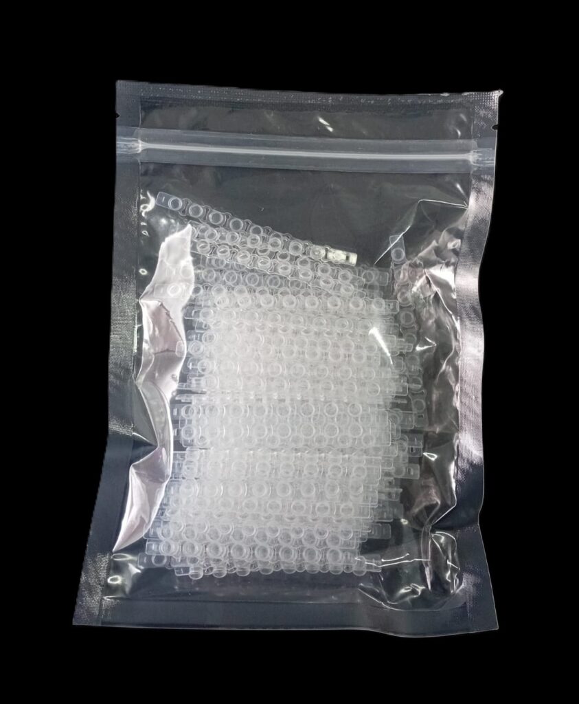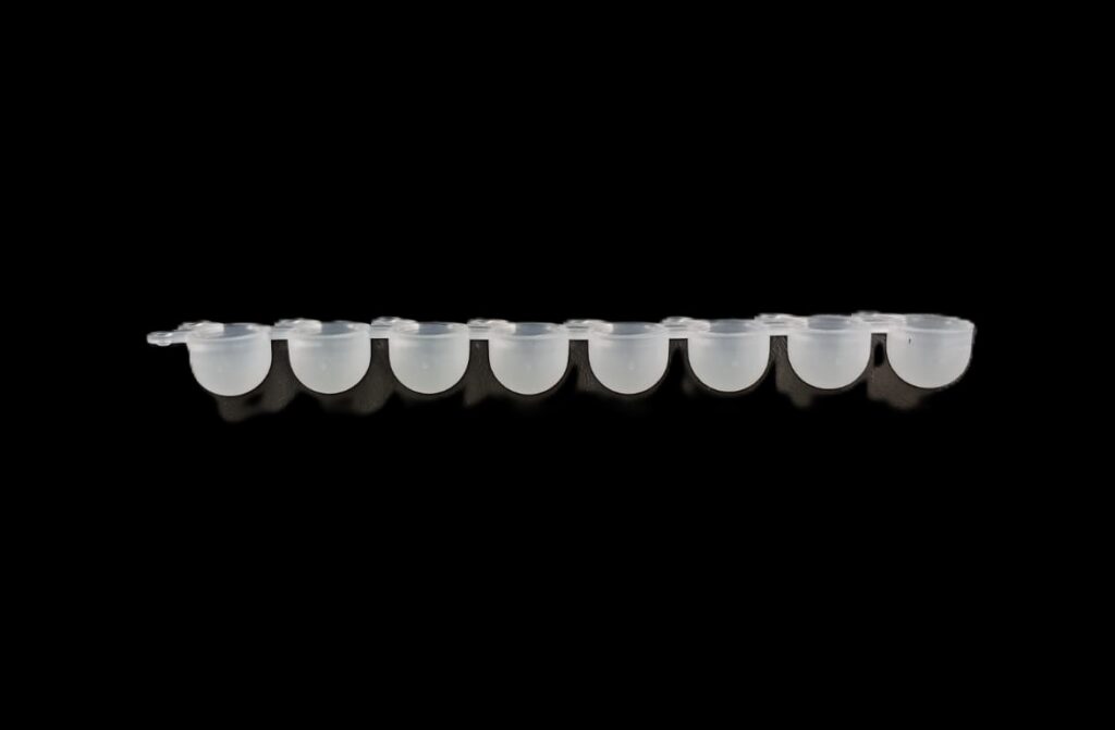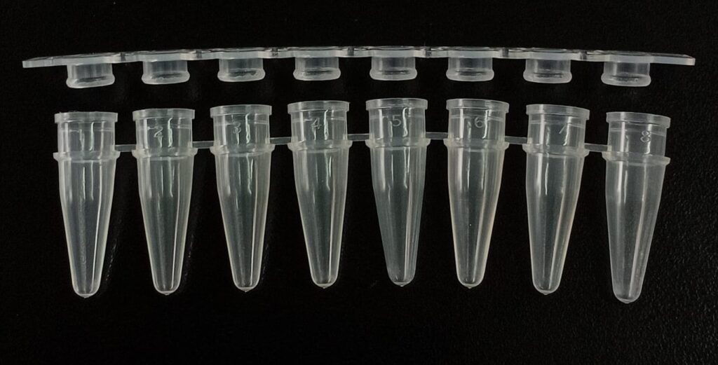 PCR de 0,2 ml en TIRAS de 8 de polipropileno autoclavable ultra claro (se suministran por separado en bolsas con cierre tipo zip lock tiras de 8 tubos + tiras de 8 tapas planas).Pre estériles por OE, libres DNAsa, RNAsa e inhibidores de PCR.