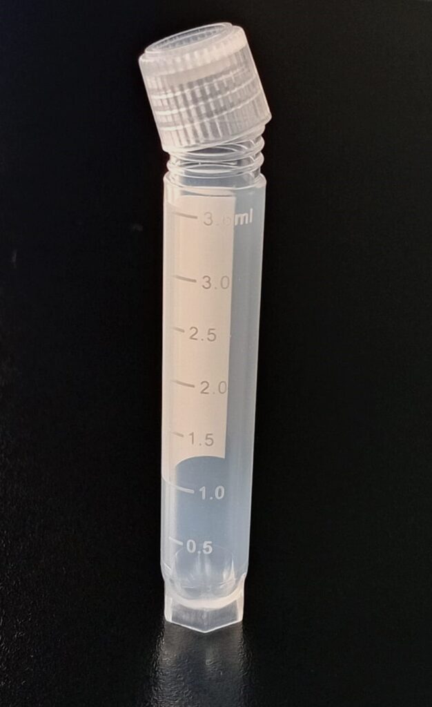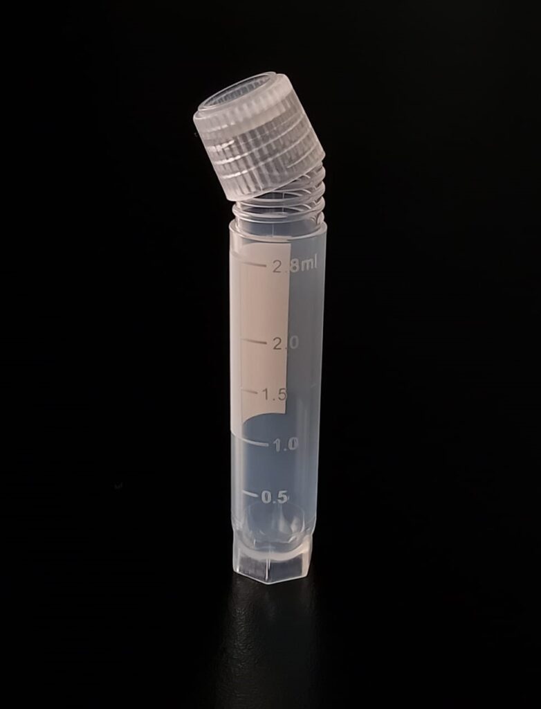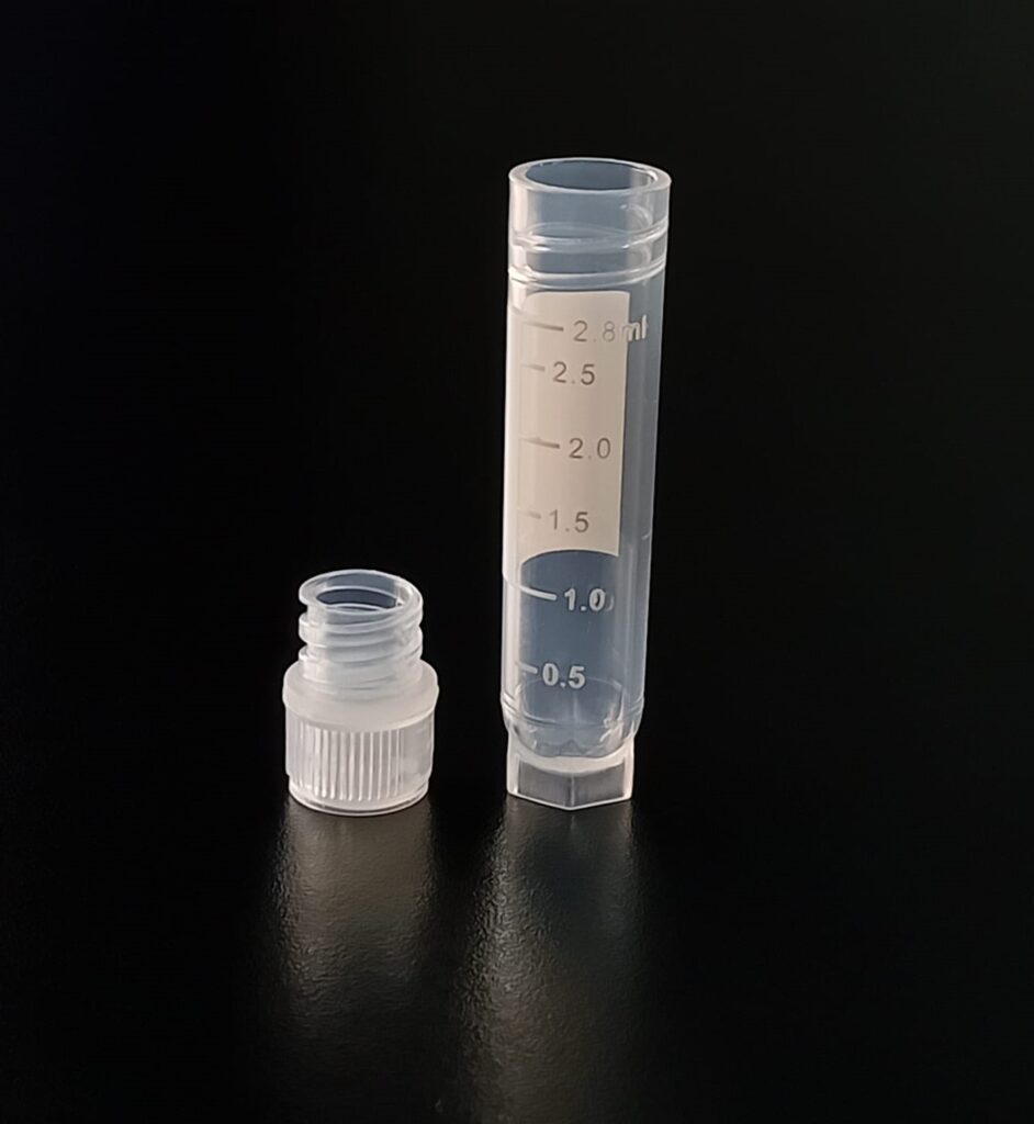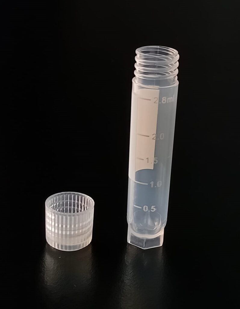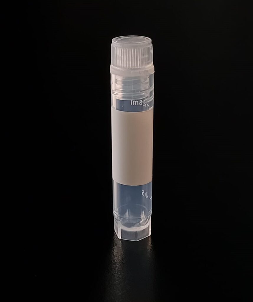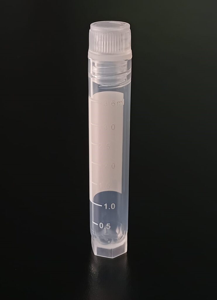 Criovial ROSCA EXTERNA de 3 ml con junta y faldón graduado, libre de DNAsa y RNAsa. Con graduación y banda mate para rotulado serigrafiadas. Tubos en polipropileno autoclavable a 121°C resistente a temperaturas hasta –196 ºC (sumergible en nitrógeno líquido solamente en estado gaseoso). El tapón en polipropileno incorpora una junta interna de silicona que asegura una hermeticidad total; y admite plaquetas de identificación. PRE Estériles x OE Libres de DNAsa, RNAsa y pirógenos