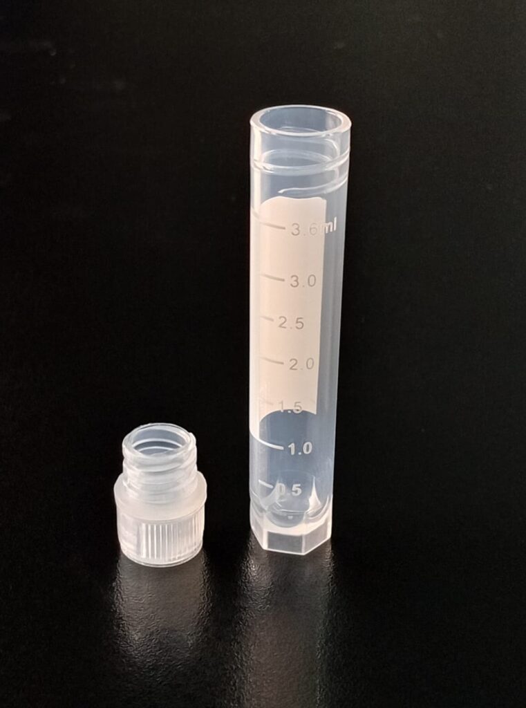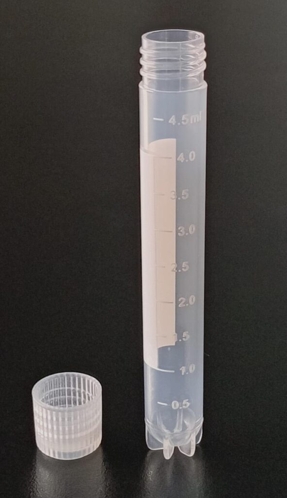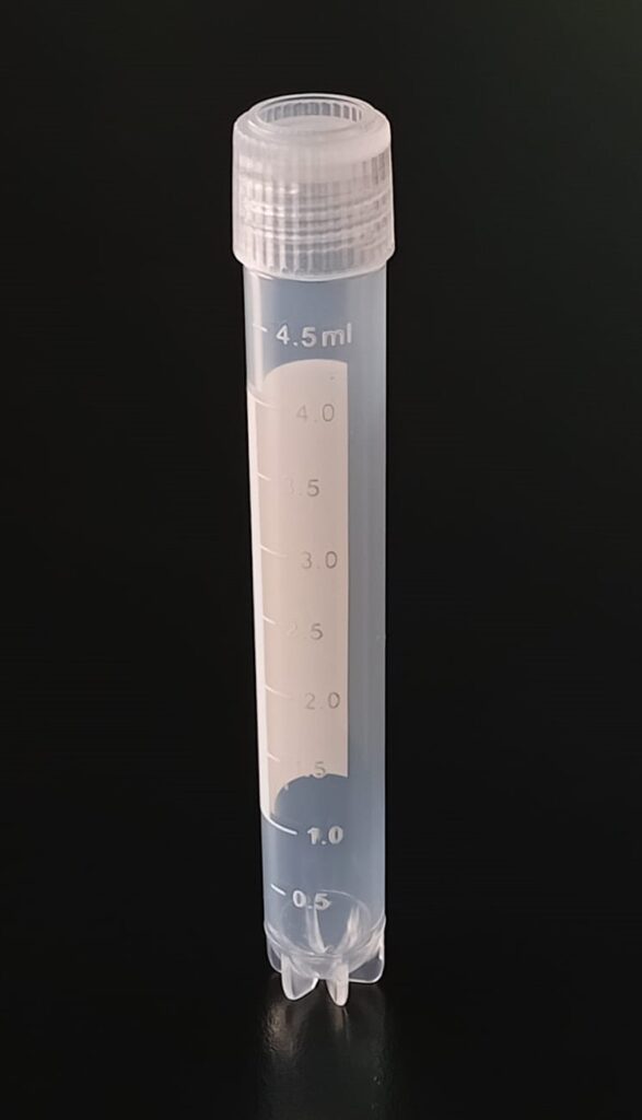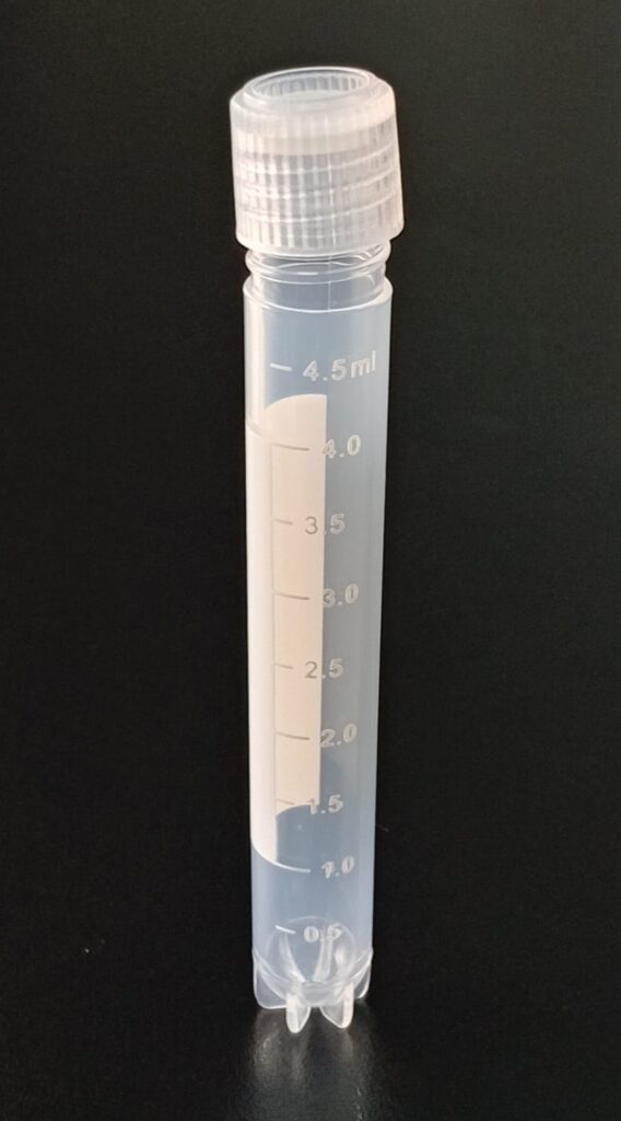 Criovial ROSCA EXTERNA de 4 ml con junta y faldón graduado, libre de DNAsa y RNAsa. Con graduación y banda mate para rotulado serigrafiadas. Tubos en polipropileno autoclavable a 121°C resistente a temperaturas hasta –196 ºC (sumergible en nitrógeno líquido solamente en estado gaseoso). El tapón en polipropileno incorpora una junta interna de silicona que asegura una hermeticidad total; y admite plaquetas de identificación. PRE Estériles x OE Libres de DNAsa, RNAsa y pirógenos