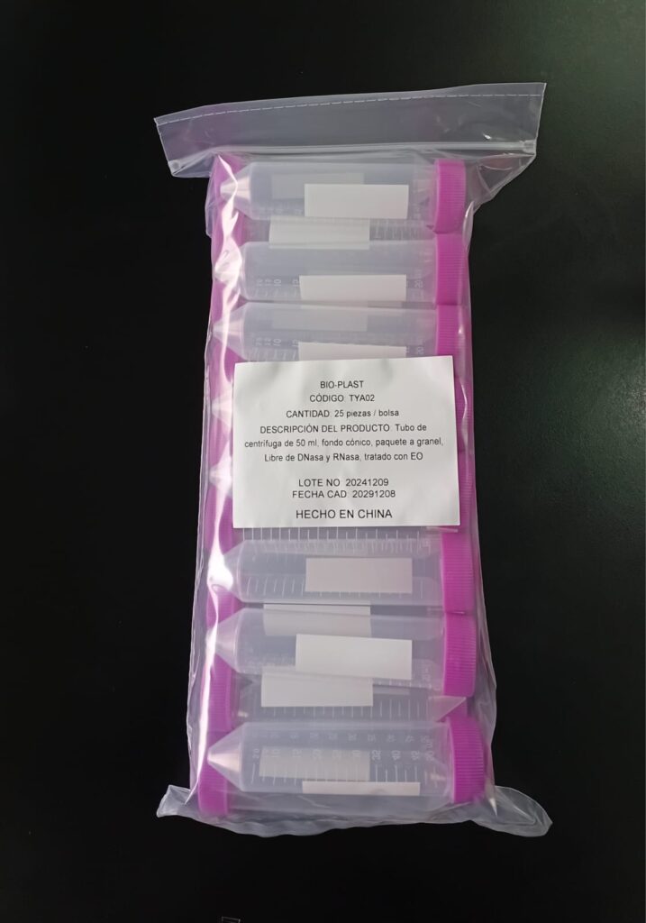 Código: 185TYA02FREE CH Caja cerrada: 500 Venta mínima / Presentación: 25 INFORMACIÓN DETALLADA: Tubo 50 ml SIN faldón, tapa rosca. Estéril OE Libre de DNAsa y RNAsa Bolsa por 25 unidades. Tubos en polipropileno autoclavable transparente. Tapón en polietileno estriado color violeta Presentados en bolsas con cierre para su mejor almacenamiento. Contenido bolsa: 25 unidades Read More