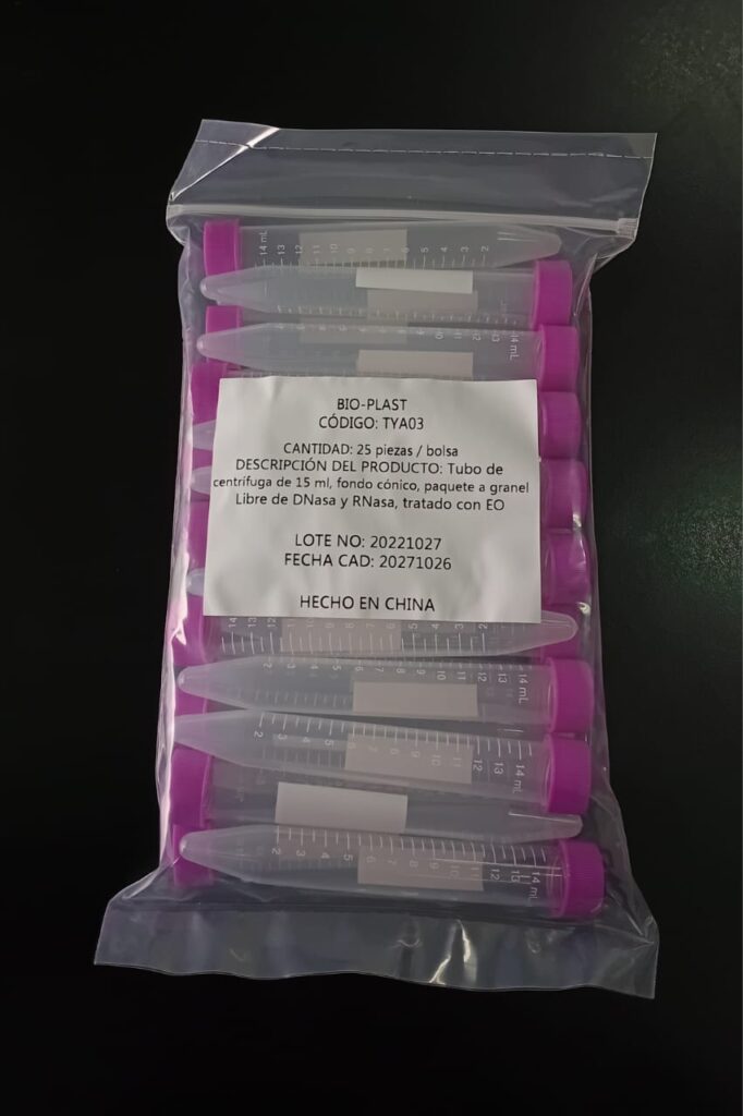 Código: 1850108 IA Caja cerrada: 5000 Venta mínima / Presentación: 500 INFORMACIÓN DETALLADA: Tubo cónico 15 ml tapa rosca, graduado de molde a granel. Tubo en polipropileno autoclavable, graduado de molde cada 0,5 ml, tapa a rosca en polietileno estriado color celeste. Presentados en bolsas con cierre para su mejor almacenamiento. Contenido bolsa: 500 unidades Read More