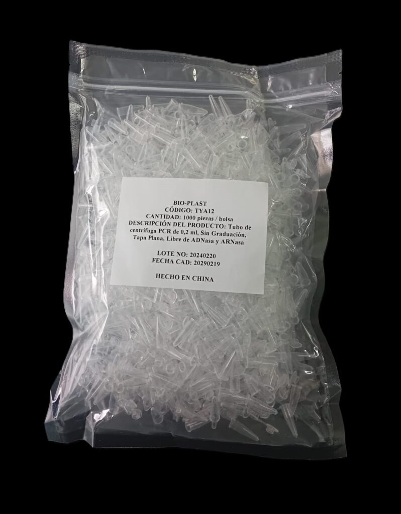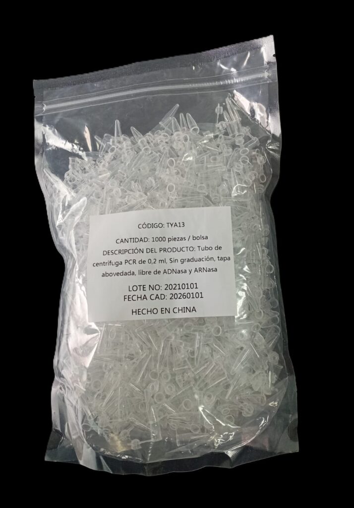 Código: 185TYA12FREE CH Caja cerrada: 10000 Venta mínima / Presentación: 1000 INFORMACIÓN DETALLADA: Microtubo PCR de polipropileno autoclavable ultra claro (grado médico) de 0,2 ml, graduado con banda mate tapa plana. Pre ésteriles por OE, libres DNAsa, RNAsa e inhibidores de PCR. Apto para QPCR Y PCR en tiempo real. Presentados en bolsas con cierre para su mejor almacenamiento. Contenido bolsa: 1000 unidades Read More