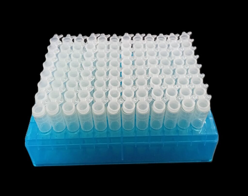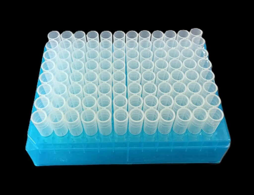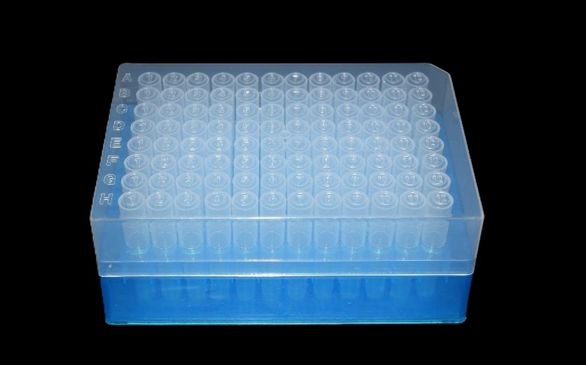Código: 185TYA16-96 CH Caja cerrada: 100 X 96 Venta mínima / Presentación: 10 X 96 INFORMACIÓN DETALLADA: Rack completo 1,2ml 96 tubos, incluye tubos y tapas en tiras de 8.Rack en polipropileno autoclavable a 121°C color azul, tapa PP traslúcida con identificación alfanumérica, para 96 tubos fondo redondo de 1,2 ml dispuestos 8 x 12. Autoclavable y apilable, resistente hasta -100°C. Rack, tapa, tubos fabricados en polipropileno. Tapones en polietileno de baja densidad con pestaña para facilitar su manipulación. Las tiras de tubos ya presentados en el rack, las tiras de tapas se suministran aparte en bolsa con cierre tipo zip-lock. Read More