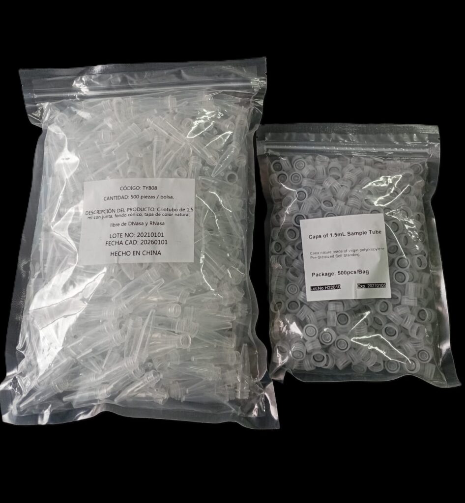 Código: 185TYB08FREE CH Caja cerrada: 5000 Venta mínima / Presentación: 500 INFORMACIÓN DETALLADA: Microtubo tapa a rosca resistentes a -196°C de PP 1,5 ml, f/cónico libre de DNAsa y RNAsa (tubo + tapa) Tubos fabricados en polipropileno autoclavable a 121°C transparente. Producto ideal para almacenamiento de muestras durante largos periodos de tiempo. PRE Estériles x OE Libres de DNAsa, RNAsa y pirógenos SE ENTREGAN TUBOS Y TAPAS EN BOLSAS SEPARADAS CON CIERRE ZIP-LOCK. Contenido bolsa: 500 unidades Read More